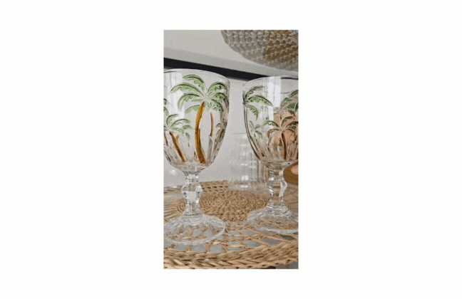 Con un diseño tallado de palmeras en tonos verde y marrón, estas copas de vidrio resistente te transportan a una postal tropical.